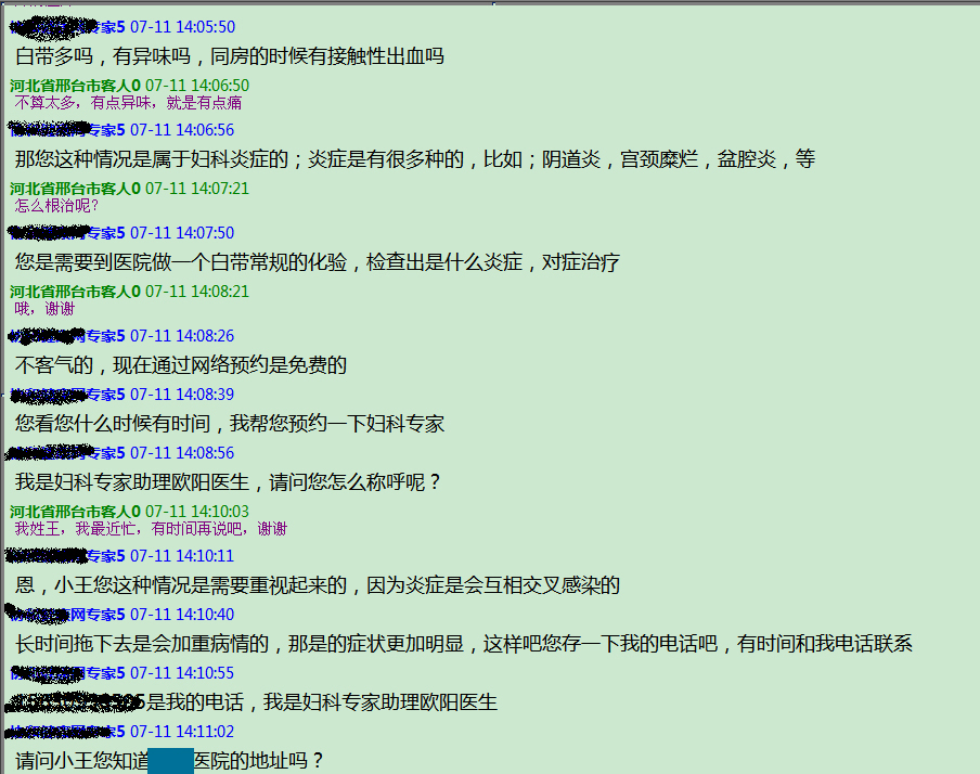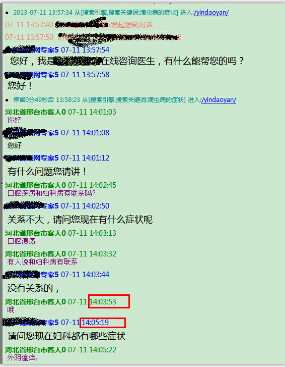 在看上图,客服在回答完对话以后,访客只进行了个“哦”的回复,试想一下,如果你是患者,你会有什么感觉?如果是我,我会感觉到突然间没有话了,那我接下来进行的,就是对话窗口的关闭!而我们从搜索关键词来看,访客确实有对《滴虫性阴道炎》的了解需求。那么,我们接下来是不是应该抛出来一个问题呢?那又该怎么抛出来这个问题呢?接下来看对话: