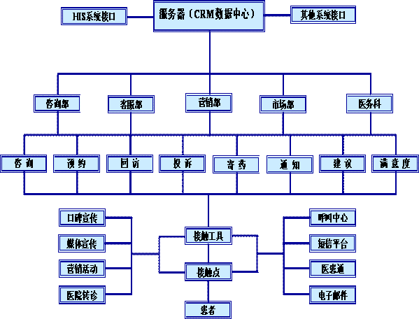 第三阶段就是抓好客户服务中心的管理工作,为患者提供诊前、诊中、诊后的一体化服务。具体而言就是建设CRM系统。如下图: