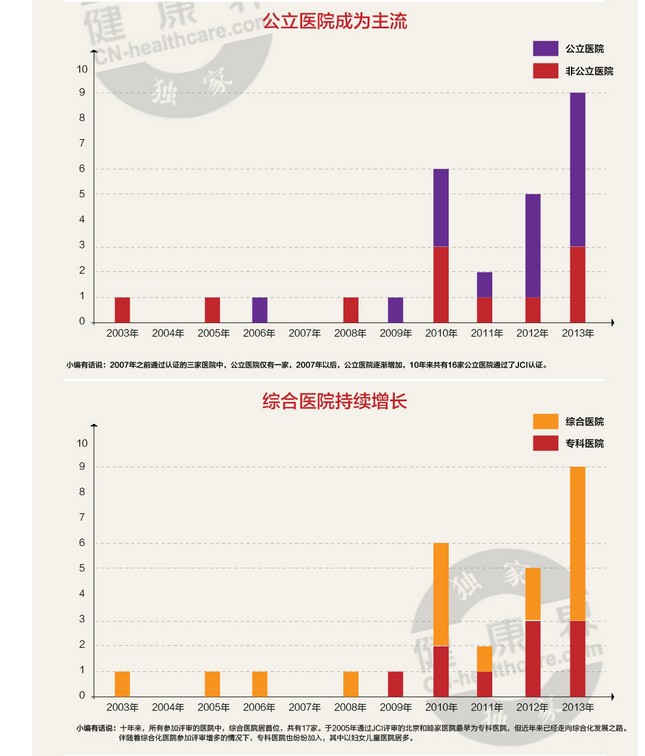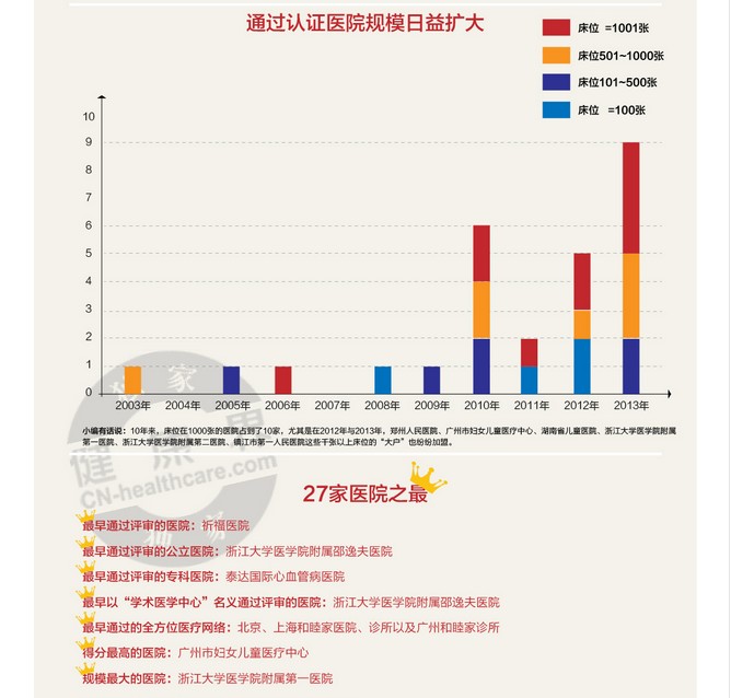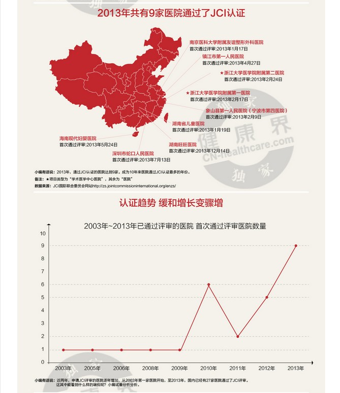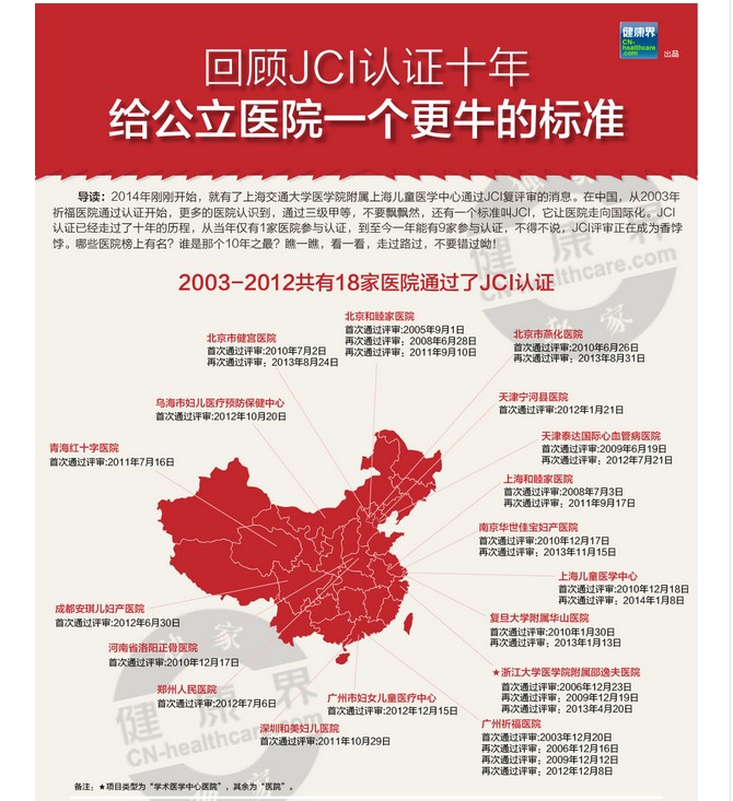 在中国,从2003年祈福医院通过认证开始,更多的医院认识到,通过三级甲等,不要飘飘然,还有一个标准叫JCI,它让医院走向国际化,JCI认证已经走过了十年的历程,从当仅有1家医院参与认证,到至今一年能有9家参与认证,不得不说,JCI评审正在成为香饽饽,哪些医院榜上有名?谁是那个10年之最?瞧瞧,看一看,走过路过,不要错过哦!