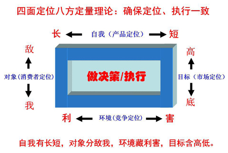 如图所示,叫"四面定位,八方定量理论",当我们操盘一家医院的时候,要从四个方面、八个角度上去分析和决策,最终得出比较科学的结论,这就是大脑的"脑图"。因为思路正确才能保证决策和行动的正确。简单的讲就是把一个医院或科室看成一个整体项目,从自我(产品定位)、环境(竞争定位)、对象(消费者定位)、目标(市场定位)四个方面多角度的全面分析,把主要矛盾、次要矛盾逐个梳理;把母环、子环逐一分解,才能做到环环相扣。当如此操作后,你就会很清楚的发现:在医院管理、市场策划、操作执行等层面存在哪些问题?如何解决?才能保证整体目标的成功。以下详细展开说明。