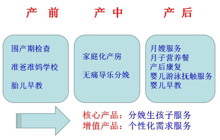 如图所示,我们把产科的产品服务线按照孕妇生产周期,设定了产前、产中、产后三个服务路径。每一个路径都有很多服务项目要做。