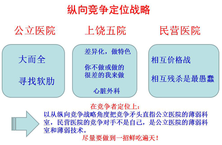 一句话,民营医院一直不知道真正的竞争对手是谁!无须用具体的数字说明,大家都清楚,95%以上的市场份额捏在公立医院的手里,民营医院一直在夹缝中生存。首先是民营医院相互争夺的空间非常狭小;其次是与公立医院的整体性正面竞争绝无可能。那么,民营医院的竞争定位如何实现?