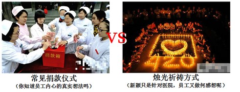 刚刚过去的雅安地震,除了常见的捐款仪式、默哀仪式,我毫不怀疑大家的真诚,只是作为管理者,你曾否想过更加激发人道主义感情、更加能够呼唤爱心的仪式:组织员工进行烛光祈祷仪式;在没有正式宣布放弃搜救之前,每天都为逝者默哀一次,生者祈祷一次(每次前面有个深情的引导词)………
