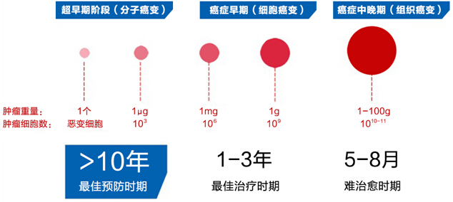 肿瘤细胞是由“叛变”的正常细胞衍生而来,经多年后长成肿瘤。“叛变”细胞脱离正轨后会自行增殖,只有“叛变”细胞累积到10亿个以上时,常规的医学检测才会察觉到。一般在医院常规检测出有癌症时,癌细胞至少已经在体内存在了5-12年。癌细胞的增殖速度是以倍增时间计算的,1个变2个,2个变4个,以此类推。比如胃癌、肠癌、肝癌、胰腺癌、食道癌的癌细胞倍增时间平均是33天,乳腺癌倍增时间是40多天。由于癌细胞不断倍增,癌症越发展到晚期,进展速度越快。因此,癌细胞基因突变是癌症特异的早期分子标志。