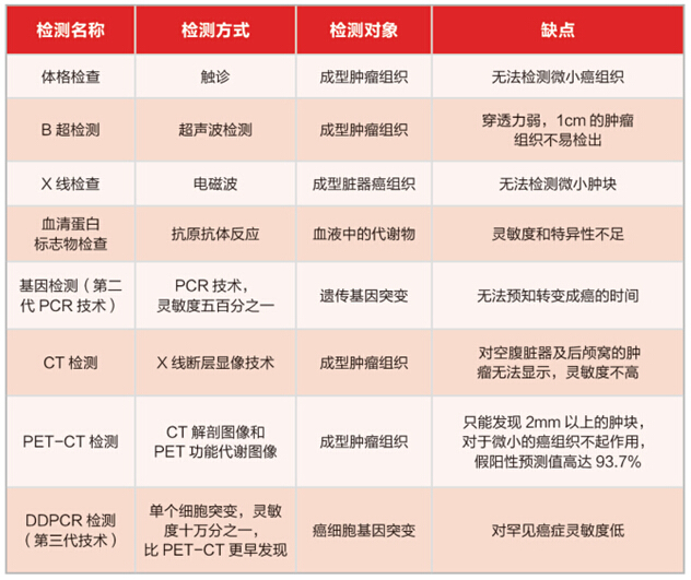 目前各种癌症早期筛查技术对比如下: