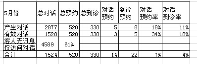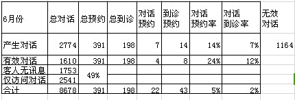 总共是1610条有效对话预约率是24%也就是4条有效对话一个预约,8条有效对话一个到诊,可是我们这里面的无效对话就有1164条,这些对话都是患者直说了一句俩句就不了了之了,{PS:有效对话的比例我们是4:4也就是对话类型里面访客和客服发送信息大于4条算一个有效}这1164条无效对话应该是我们深度检讨的问题所在,这些对话是我们和患者有过沟通的对话,可是我们没把握住,如果你把握住了这些无效对话,不说多的,百分之三十也就是348条对话,按有效对话的比例算就是87个预约,43个到诊啊。