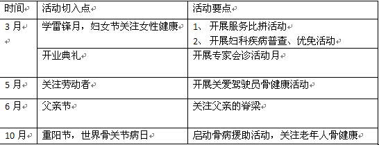 与郴州红十字会(拟)联合发起援助贫困骨病患者的活动(具体合作方案待定),并合理利用医保政策,使之形成一个社会效益与经济效益双丰收的主打品牌活动。同时,不定期地走进社区义诊、参与民间公益组织(比如郴州义工联)等开展的公益慈善活动,来为医院的形象加分。