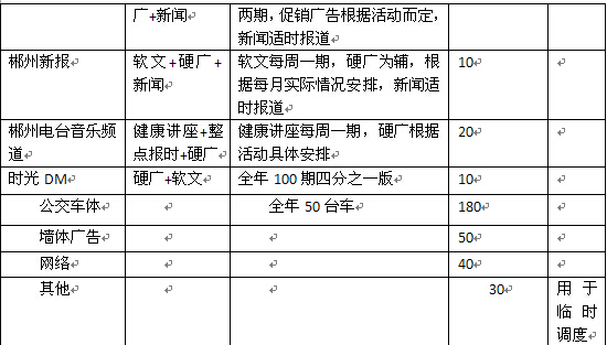 考虑到2013年是打开知名度的第一年,在媒体选择上注重全方位、多角度、立体式组合,以电视、报纸、公交车、电台、网络为主, DM直投及其他小众媒体为辅。在预算方面,年度目标业绩初步定为2000万,广告投入按20%算,全年广告费用为400万元,本着合理开支、节约成本的思想,三个月后根据媒体效果评估及实际完成的目标业绩按比例进行调整,严格将全年宣传费用控制在20%以内,每个月出具当月媒体投放计划。